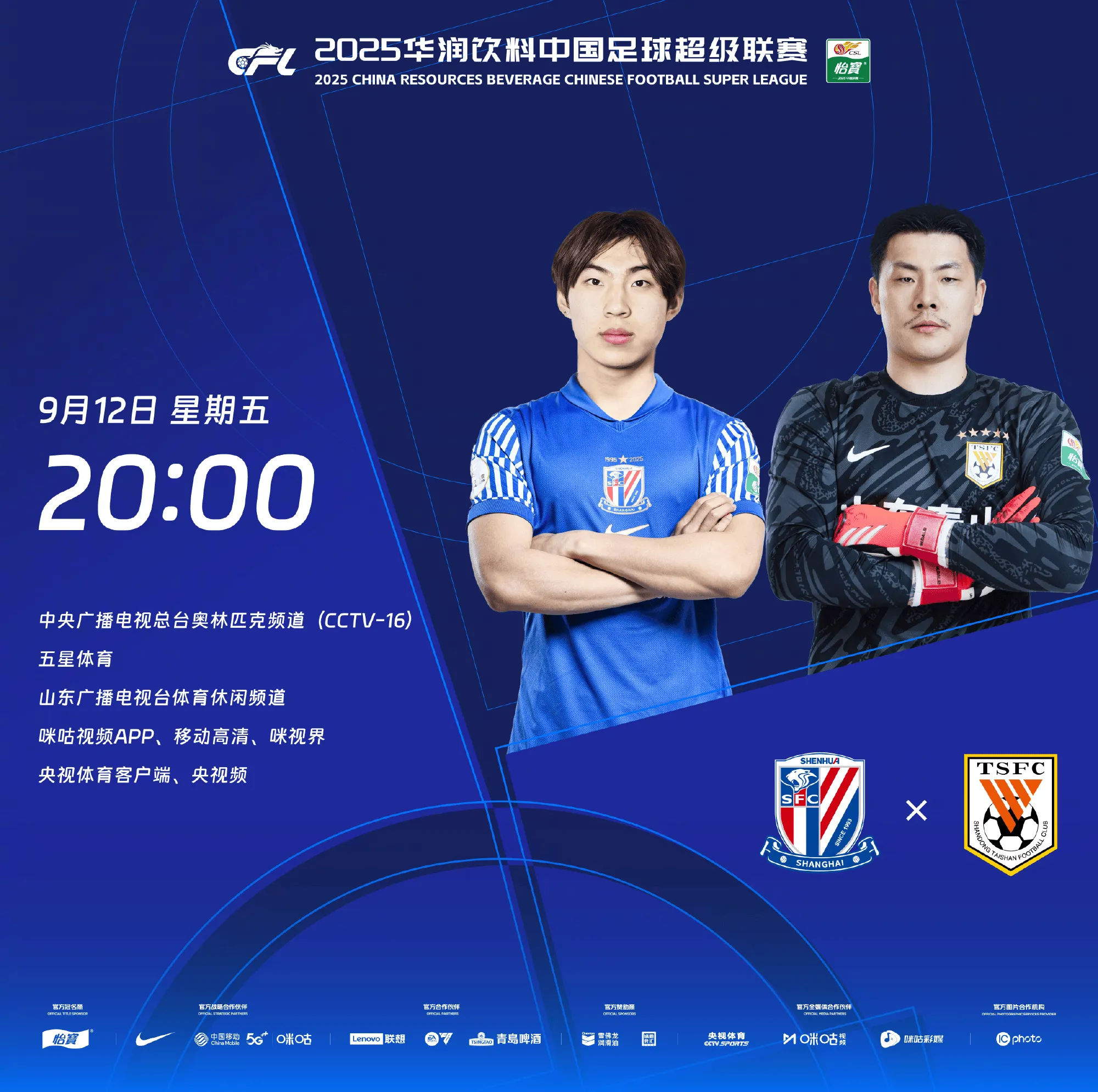 山东泰山首发:14-王大雷、5-郑铮、6-王彤、15-路易斯-洛佩斯、11-刘洋、55-彭啸、8-马德鲁加、23-谢文能、10-卡扎伊什维利、29-陈蒲、38-李小恒